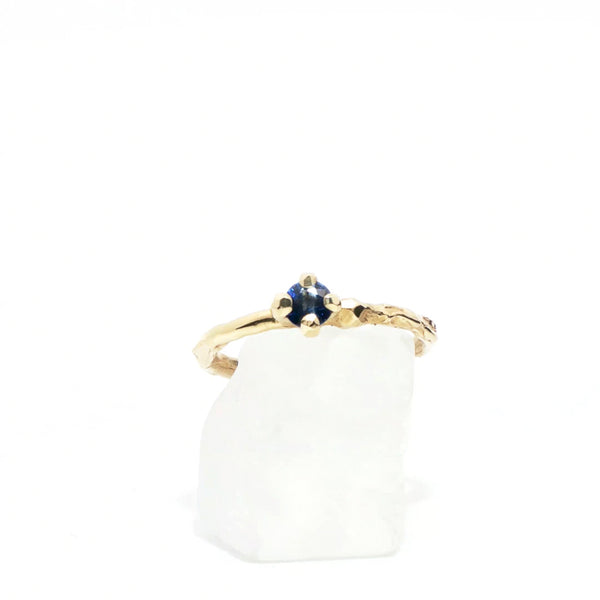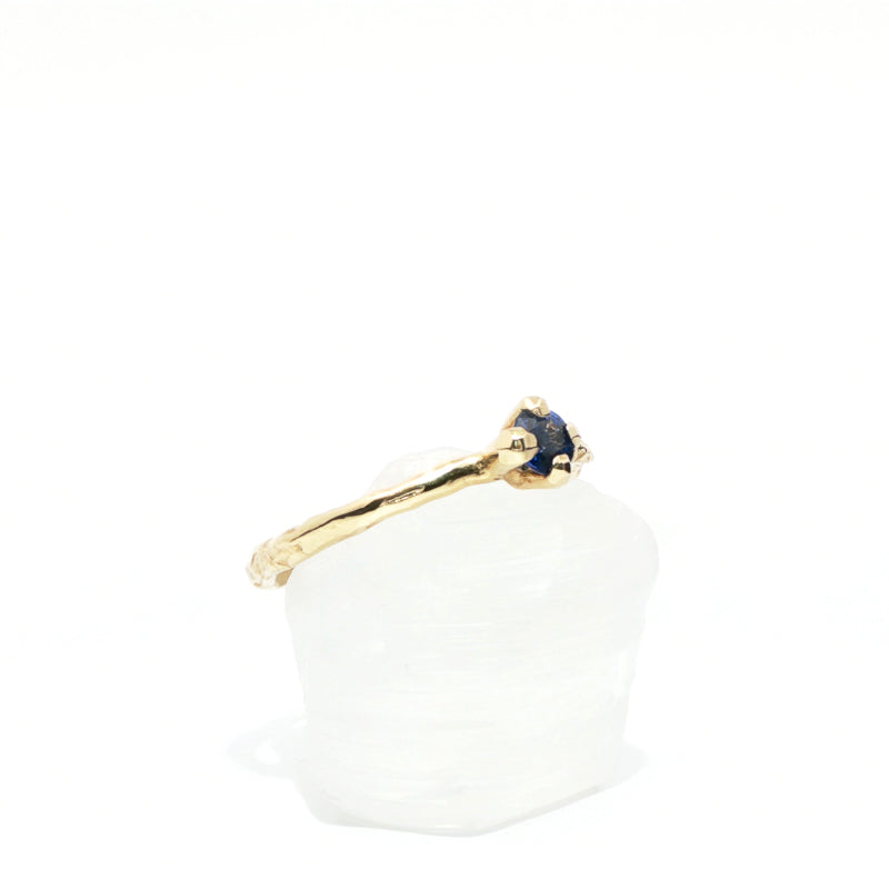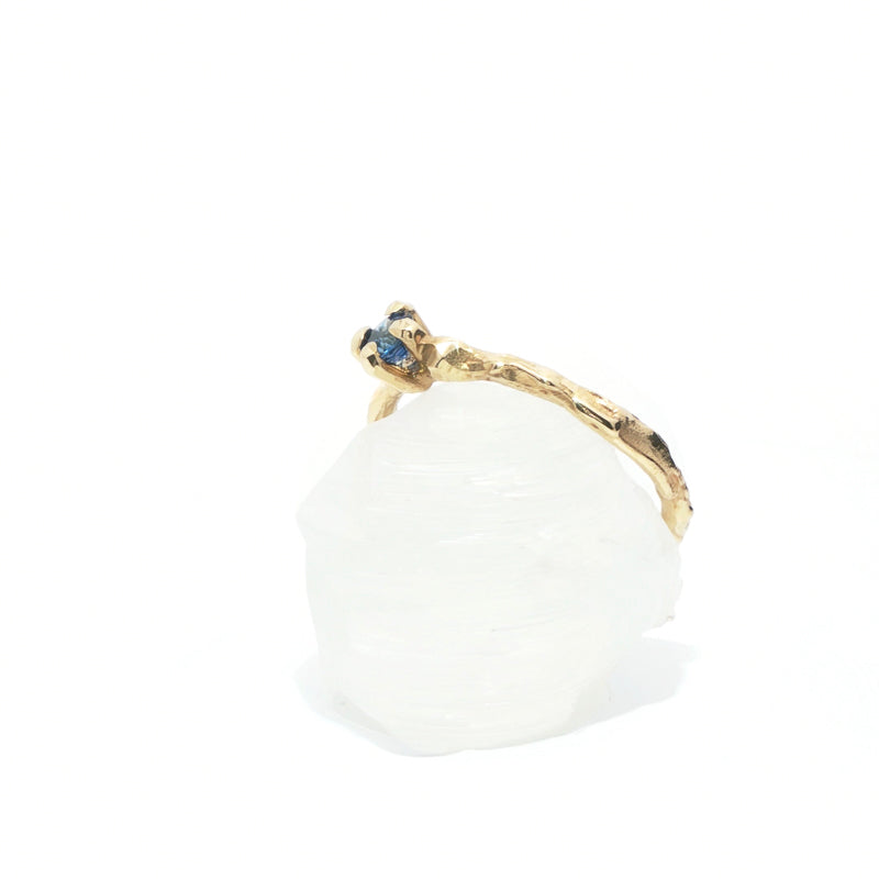 Met de hand gesneden tot een slank, takachtig silhouet, viert het imperfectie als schoonheid. Elke richel is de echo van een momentopname, een herinnering aan de landschappen van het hart die kunnen ontstaan door onze ervaringen in het leven. Een blauwe saffier van 4 mm zit in een stevige klauwzetting en vangt het licht als ochtenddauw. De afwerking combineert matte en glanzende accenten om textuur en diepte te onthullen, een tastbare herinnering dat dit sieraad gemaakt is om zowel aangeraakt als bewonderd te worden. Met zorg met de hand gemaakt, is het een sieraad met een verhaal dat vertelt wie je bent en hoe je liefhebt.